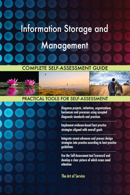 * The Self-Assessment Excel Dashboard; with the Information Storage and Management Self-Assessment and Scorecard you will develop a clear picture of which Information Storage and Management areas need attention, which requirements you should focus on and who will be responsible for them: