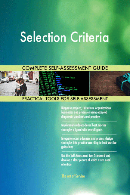 Featuring 994 new and updated case-based questions, organized into seven core areas of process design, this Self-Assessment will help you identify areas in which Selection Criteria improvements can be made.